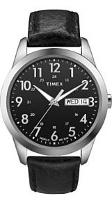Cool tones and a sleek design define this Men's Casual Dress Strap Watch from Timex. Framed by a smooth, silver-tone bezel, the round, black dial features crisp, silver-tone Arabic numerals marking the hours, an inner 24-hour track, and super-luminous, silver-tone outlined, sun-ray hands. A convenient outside minute track helps with detailed time telling, and a day and date display sits just inside three o'clock. The lightly patterned, black leather strap is accented with detail stitching and fastens with a traditional buckle for a comfortable fit. This fashionable timepiece is evenly backlit with Indiglo for better nighttime viewing, and with a water resistant depth of 99 feet (30 meters), you can confidently wear thi s versatile timepiece with casual or professional wear.Cool tones and a sleek design define this Men's Casual Dress Strap Watch from Timex. Framed by a smooth, silver-tone bezel, the round, black dial features crisp, silver-tone Arabic numerals marking the hours, an inner 24-hour track, and super-luminous, silver-tone outlined, sun-ray hands. A convenient outside minute track helps with detailed time telling, and a day and date display sits just inside three o'clock. The lightly patterned, black leather strap is accented with detail stitching and fastens with a traditional buckle for a comfortable fit. This fashionable timepiece is evenly backlit with Indiglo for better nighttime viewing, and with a water resistant depth of 99 feet (30 meters), you can confidently wear this versatile timepiece with casual or professional wear.
